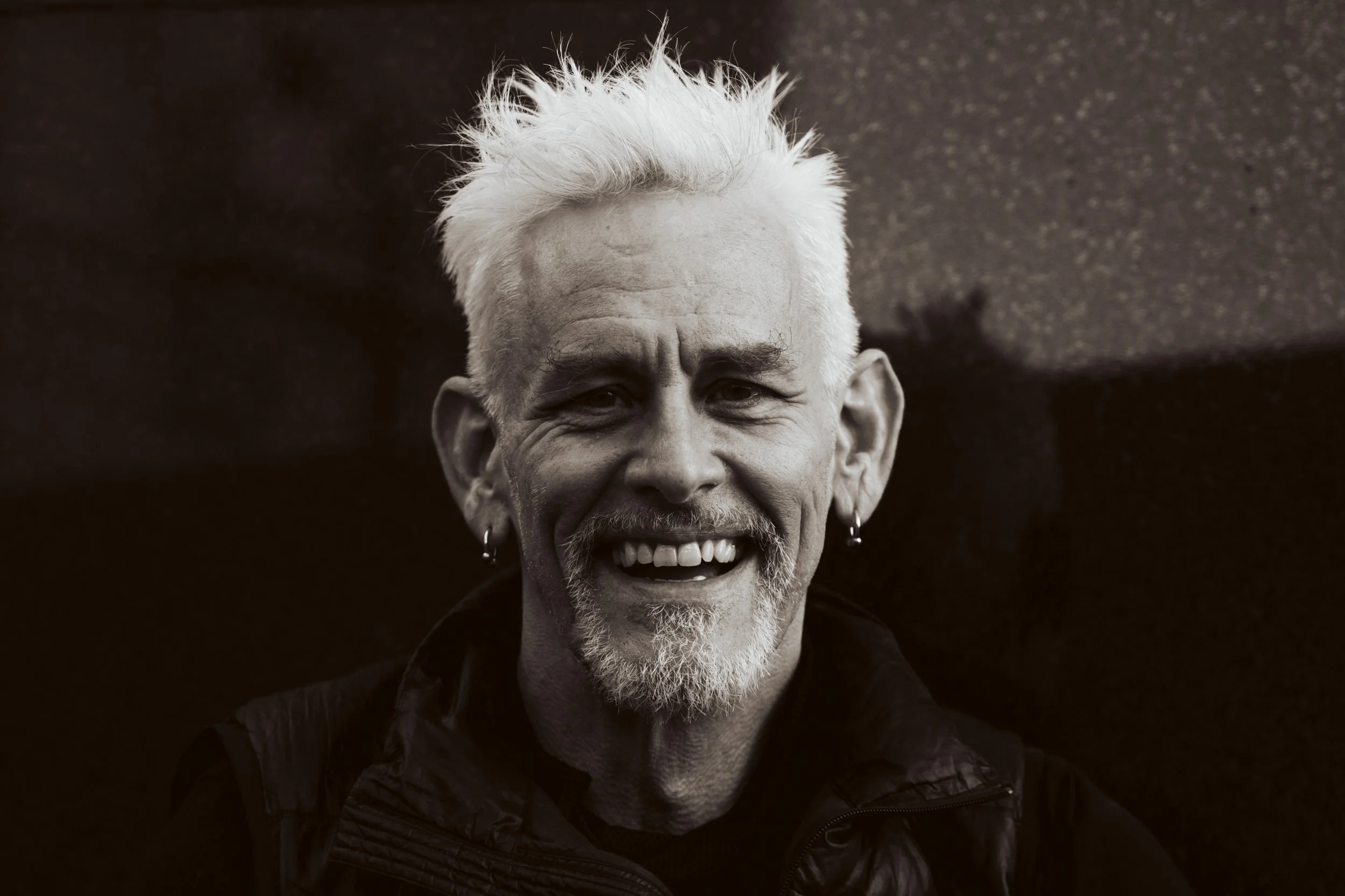 Image Description: a black and white headshot of Jess, a man with a shock of white hair looking at the camera, smiling. Photo by Robbie Sweeny.